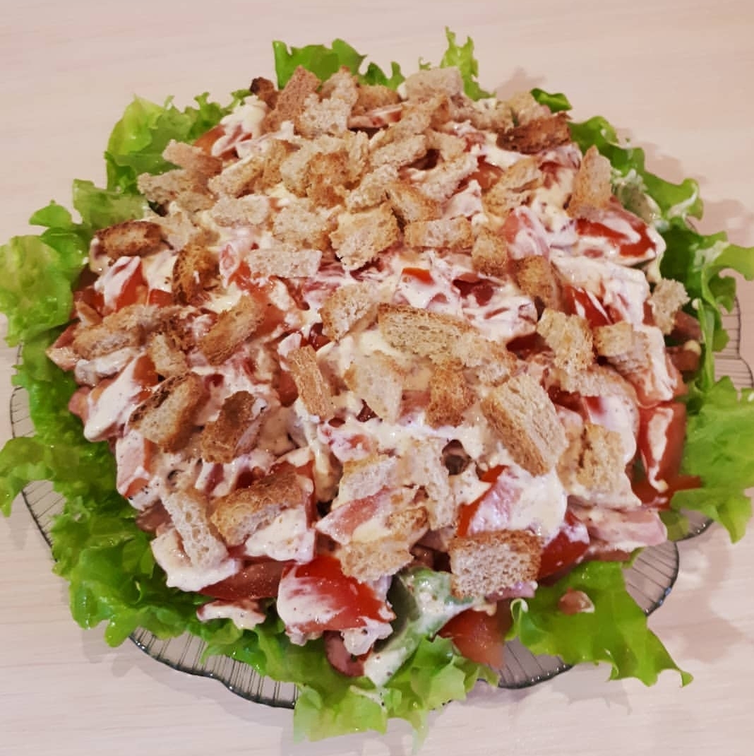 Салат 'Красные маки с курицей' — сочное сочетание нежной куриной грудки, свежих помидоров, аппетитных листьев салата и ароматного соуса, создающее яркое и запоминающееся блюдо.